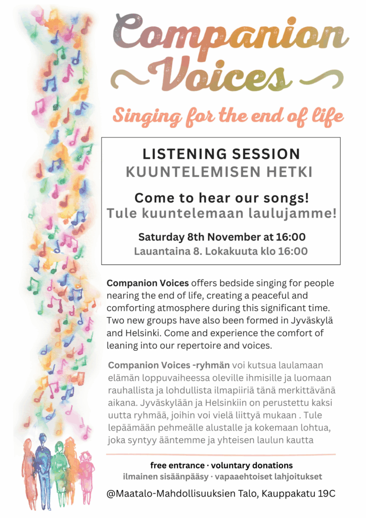 Companion Voices is a meaningful project initiated in the UK, dedicated to soothing and accompanying individuals at the end of life through beautiful and calming songs and sounds. Minna and Vanessa embarked on this heartfelt journey together last autumn, and they are excited to share experiences from their new Jyväskylä group with you, as well as their vision and plans for a new group in Helsinki! Curious? Come and listen to our songs !
